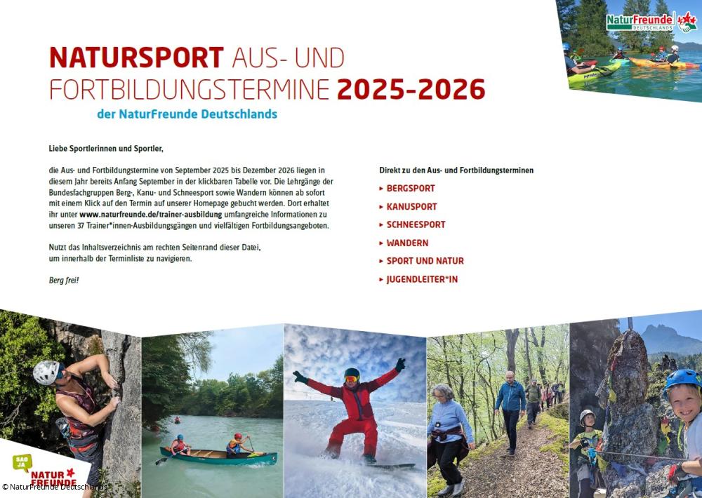 Kinderleicht werden Kursauswahl und -buchung durch die klickbare PDF-Tabelle „Natursport-Aus- und -Fortbildungstermine 2025/26 (hier Download als PDF-Datei). Mit nur einem Klick auf eine Terminzeile gelangt man direkt aus der Tabelle zum Lehrgang auf naturfreunde.de und kann sich gleich anmelden. Die Tabelle wurde bereits per E-Mail an alle aktuell mehr als 1.200 lizenzierten Trainer*innen im Verband verschickt.