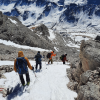 Nach der Besteigung fanden wir auch etwas Schnee, auf dem wir zur Bamberger Hütte und ins Val de Misde spuren konnten. Das Val de Misde verlangte uns sehr viel an skifahrerischem Können ab. Der wenige Schnee war sehr hart und stellenweise mussten wir die Ski tragen. Am Ende wurden die Steigeisen nochmals angezogen, um über steiles, blankes Eis ins Tal zu gelangen.