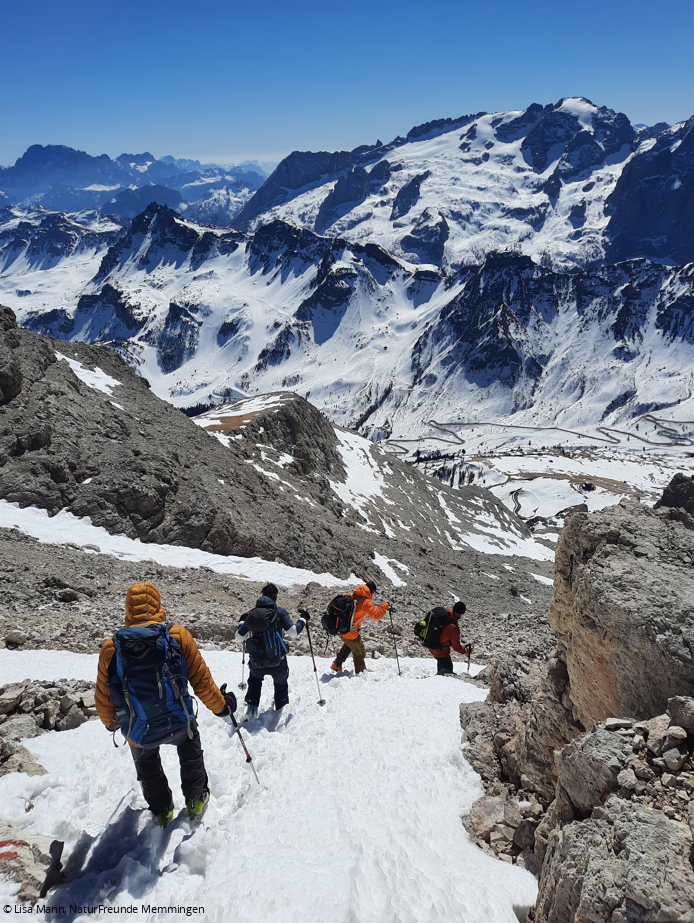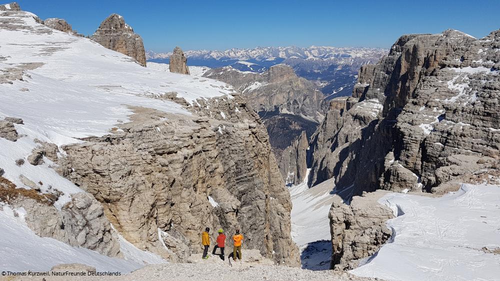 Endlich hat es geklappt! Nach drei Anläufen konnten wir – sechs NaturFreunde-Bergsportler*innen – die Dolomiten von West nach Ost durchqueren. Bei optimalen äußeren Bedingungen – nachts kalt und frostig, tagsüber sonnig und warm – starteten wir am 20. März in Welschnhofen und beendeten unsere Lehrgangstour am 25. März in Pederü. Beide Orte liegen in Südtirol.