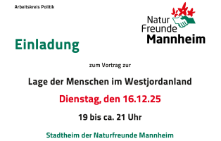 Wir freuen uns, an diesem Abend Rudolf Rogg bei den NaturFreunden Mannheim zu Gast zu haben. Er war unter anderem  Landesdirektor der Deutschen Gesellschaft für Internationale Zusammenarbeit (giz) und engagiert sich bis heute in Menschenrechts- und Friedensorganisationen in Palästina. Er kann uns so einen authentischen Eindruck von der aktuellen Lage im Westjordanland  und den Herausforderungen vermitteln.